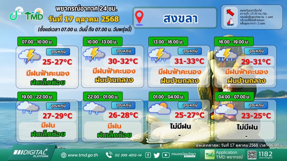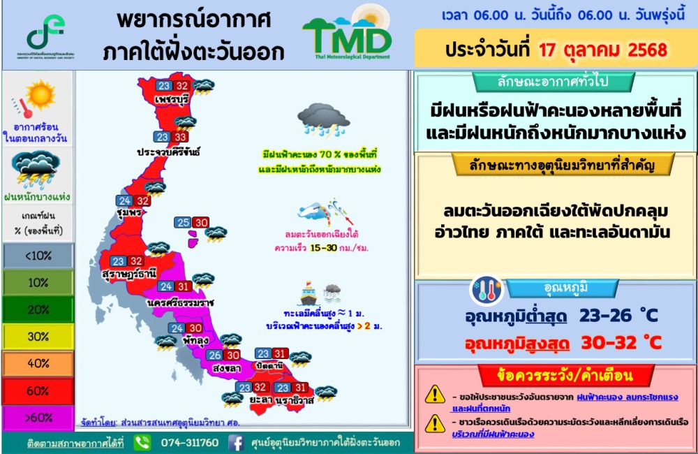 พยากรณ์อากาศภาคใต้ฝั่งตะวันออก ประจำวันที่ 17 ตุลาคม 2568เวลา 06.00 น. วันนี้ถึง 06.00 น. วันพรุ่งนี้ที่มา : ศูนย์อุตุนิยมวิทยาภาคใต้ฝั่งตะวันออก