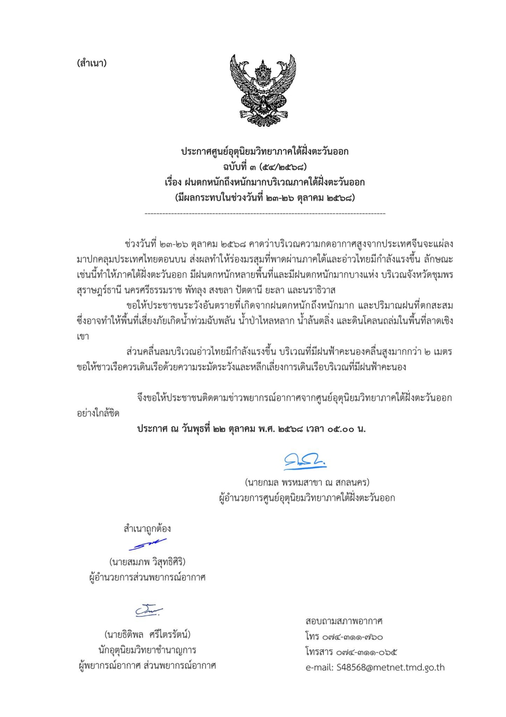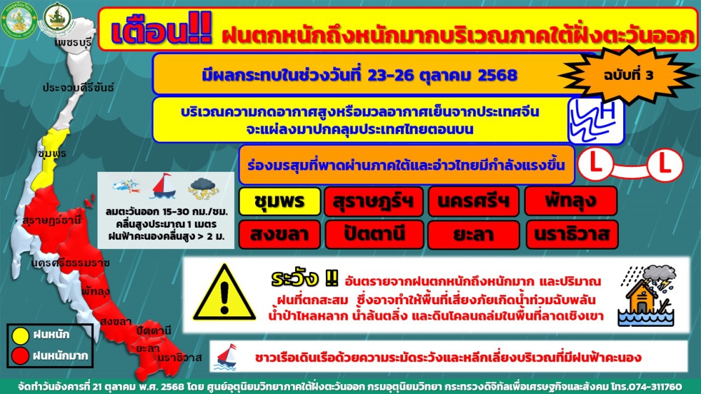 เรื่อง ฝนตกหนักถึงหนักมากบริเวณภาคใต้ฝั่งตะวันออก (มีผลกระทบในช่วงวันที่ 23-26 ตุลาคม 2568)