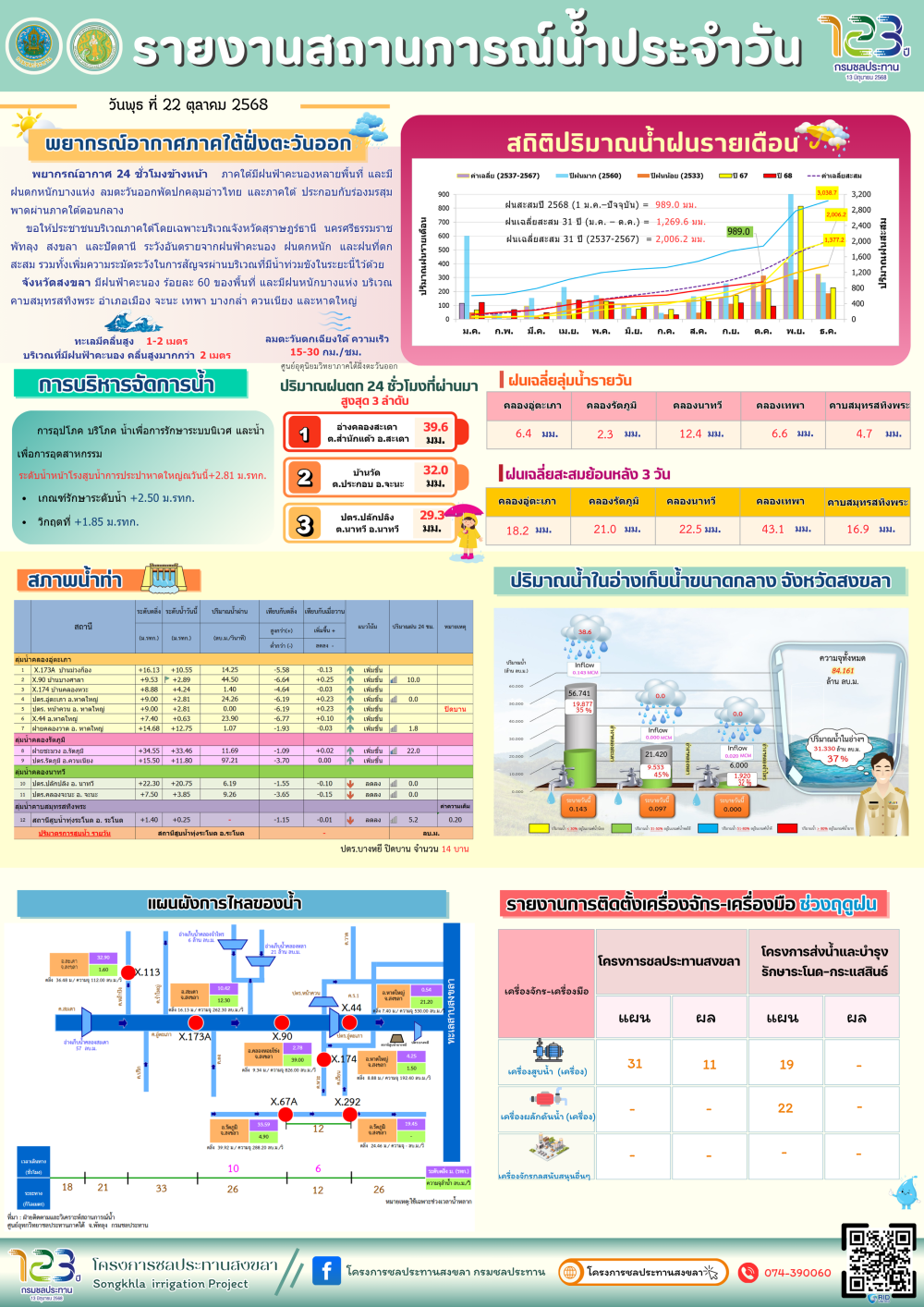 รายงานสถานการณ์น้ำ โครงการชลประทานสงขลา ประจำวันที่ 22 ตุลาคม 2568ที่มา : โครงการชลประทานสงขลา สำนักงานชลประทาน ที่ 16