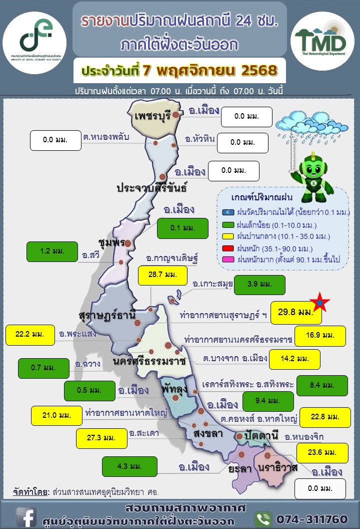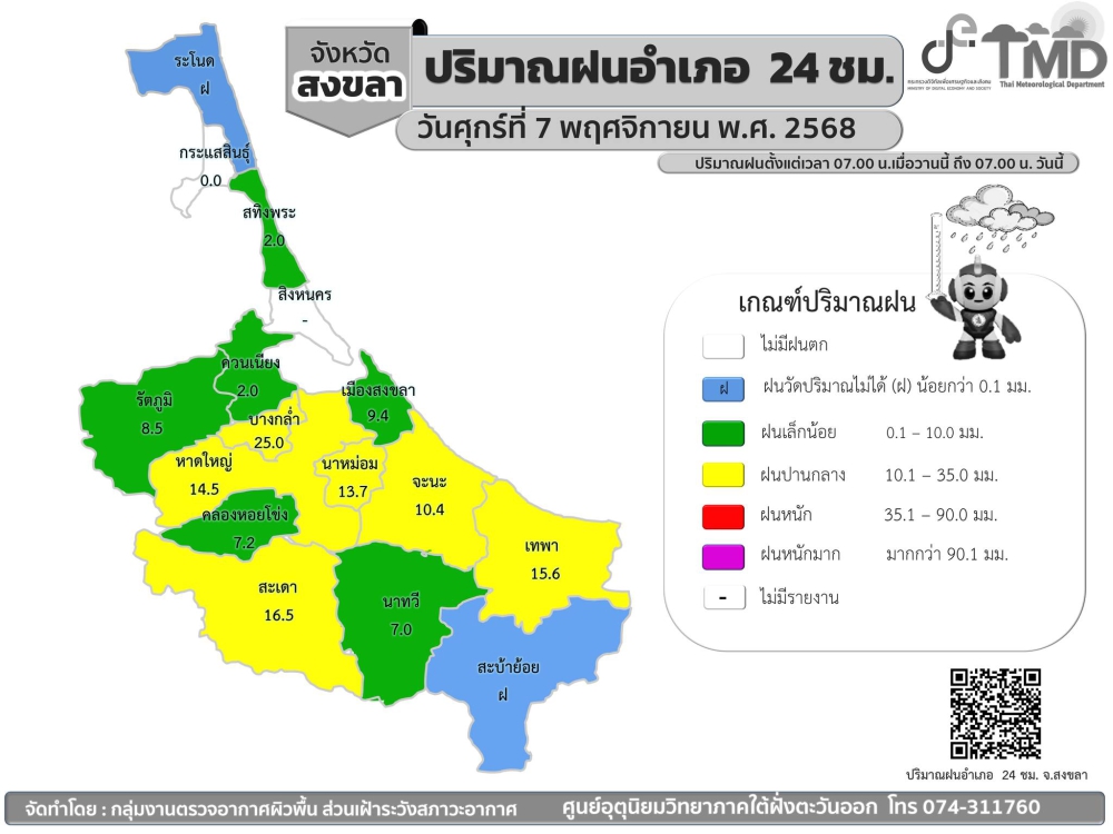 รายงานปริมาณฝนอำเภอ 24 ชม. จังหวัดสงขลา วันที่ 7 พฤศจิกายน 2568ปริมาณฝนตั้งแต่เวลา 07.00 น.เมื่อวานนี้ ถึง 07.00 น. วันนี้ที่มา : ศูนย์อุตุนิยมวิทยาภาคใต้ฝั่งตะวันออก