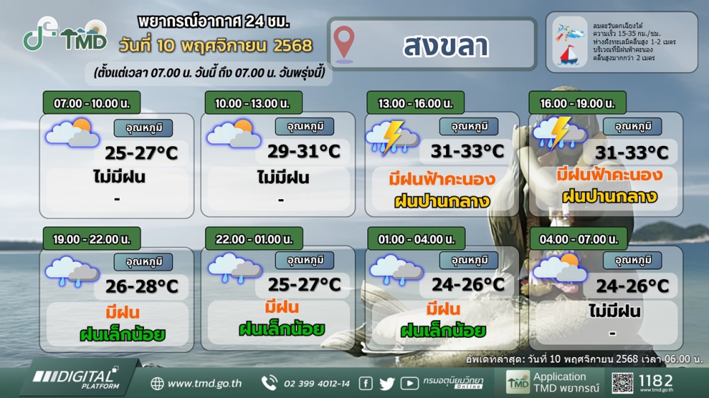 พยากรณ์อากาศภาคใต้ฝั่งตะวันออก ประจำวันที่ 10 พฤศจิกายน 2568เวลา 06.00 น. วันนี้ถึง 06.00 น. วันพรุ่งนี้ที่มา : ศูนย์อุตุนิยมวิทยาภาคใต้ฝั่งตะวันออก