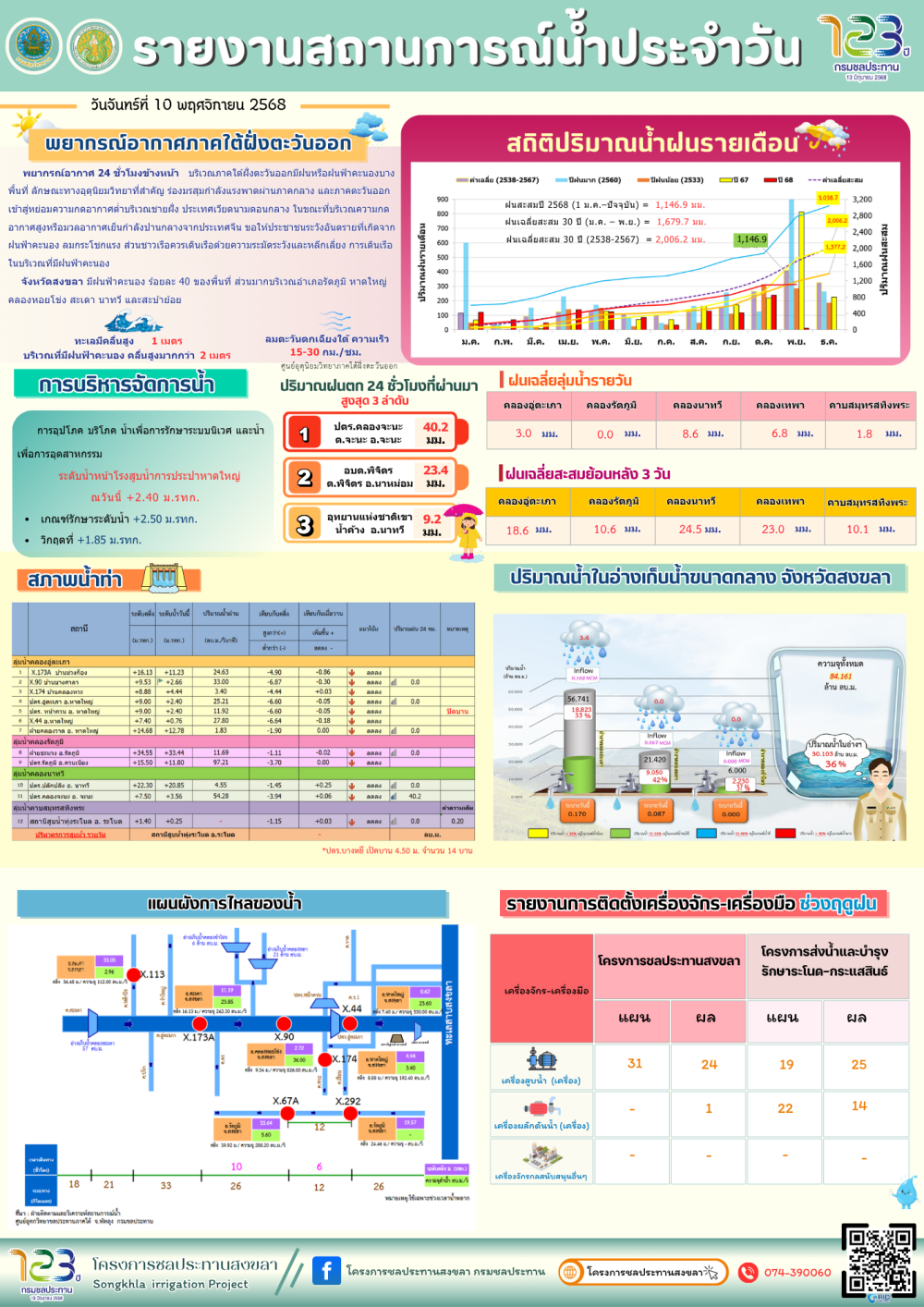 รายงานสถานการณ์น้ำ โครงการชลประทานสงขลา ประจำวันที่ 10 พฤศจิกายน 2568ที่มา : โครงการชลประทานสงขลา สำนักงานชลประทาน ที่ 16