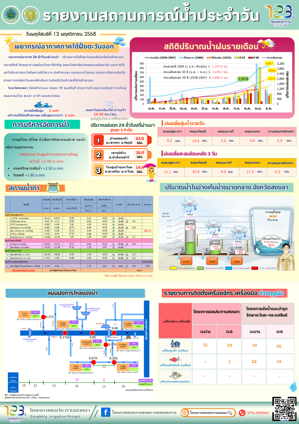 รายงานสถานการณ์น้ำ โครงการชลประทานสงขลา ประจำวันที่ 13 พฤศจิกายน 2568ที่มา : โครงการชลประทานสงขลา สำนักงานชลประทาน ที่ 16