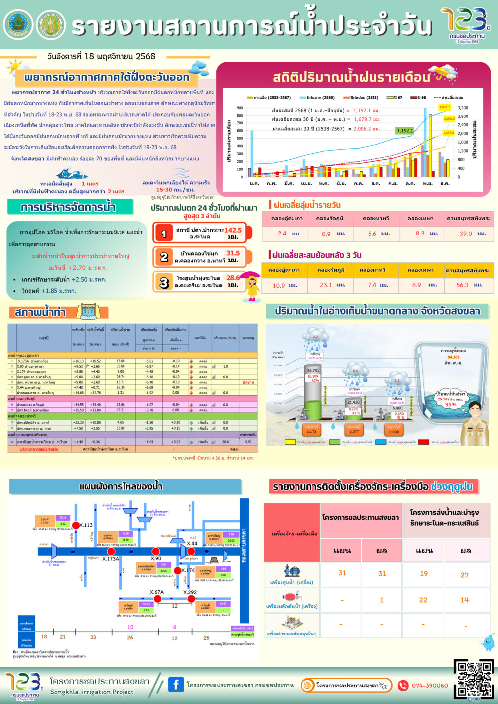 รายงานสถานการณ์น้ำ โครงการชลประทานสงขลา ประจำวันที่ 18 พฤศจิกายน 2568ที่มา : โครงการชลประทานสงขลา สำนักงานชลประทาน ที่ 16