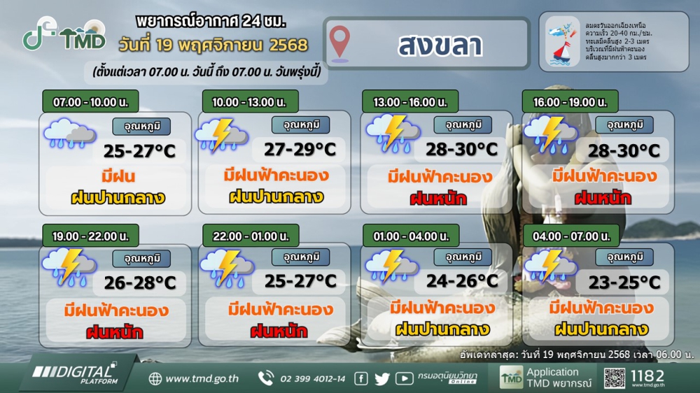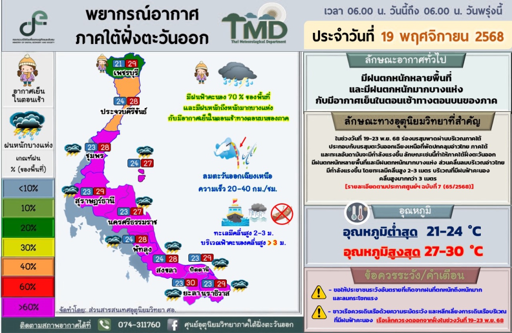 พยากรณ์อากาศภาคใต้ฝั่งตะวันออก ประจำวันที่ 19 พฤศจิกายน 2568เวลา 06.00 น. วันนี้ถึง 06.00 น. วันพรุ่งนี้ที่มา : ศูนย์อุตุนิยมวิทยาภาคใต้ฝั่งตะวันออก