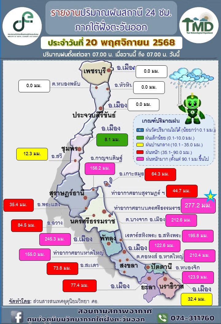 รายงานปริมาณฝนอำเภอ 24 ชม. จังหวัดสงขลา วันที่ 20 พฤศจิกายน 2568ปริมาณฝนตั้งแต่เวลา 07.00 น.เมื่อวานนี้ ถึง 07.00 น. วันนี้ที่มา : ศูนย์อุตุนิยมวิทยาภาคใต้ฝั่งตะวันออก