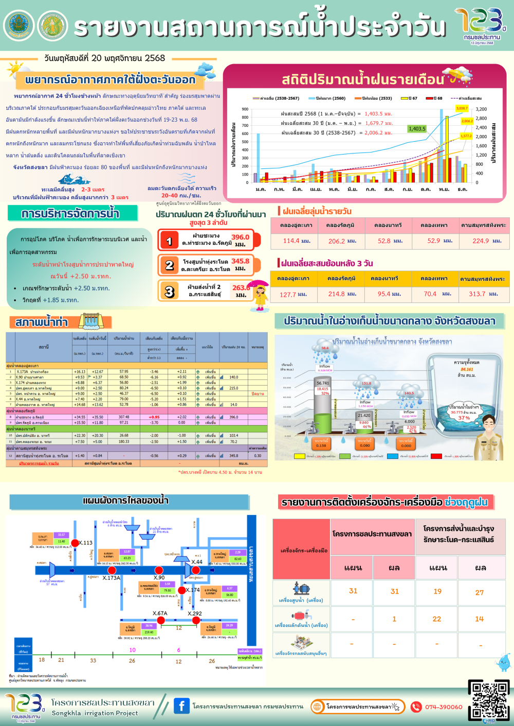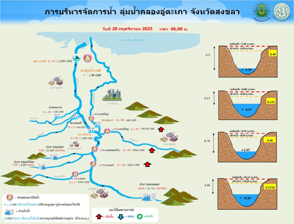 รายงานสถานการณ์น้ำ โครงการชลประทานสงขลา ประจำวันที่ 20 พฤศจิกายน 2568ที่มา : โครงการชลประทานสงขลา สำนักงานชลประทาน ที่ 16