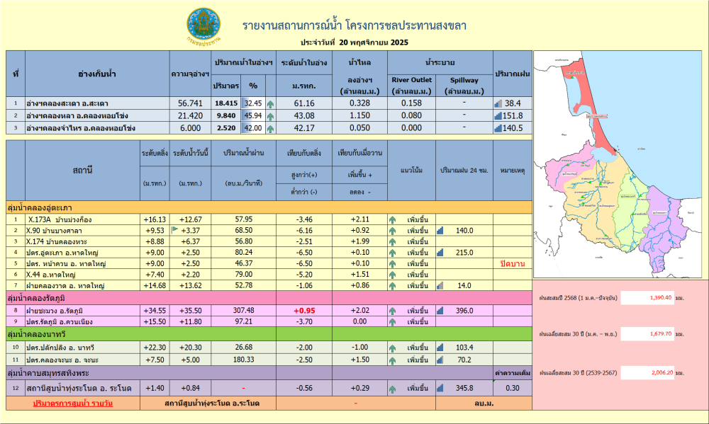 รายงานสถานการณ์น้ำ ประจำวันที่ 20 พฤศจิกายน 2568ที่มา : โครงการชลประทานสงขลา สำนักงานชลประทาน ที่ 16ที่มา : ศูนย์อุตุนิยมวิทยาภาคใต้ฝั่งตะวันออกจัดทำโดยกลุ่มสารสนเทศการเกษตร