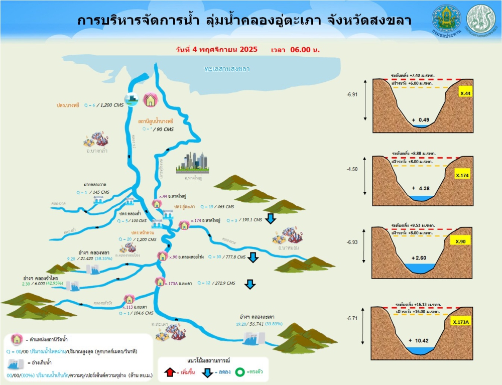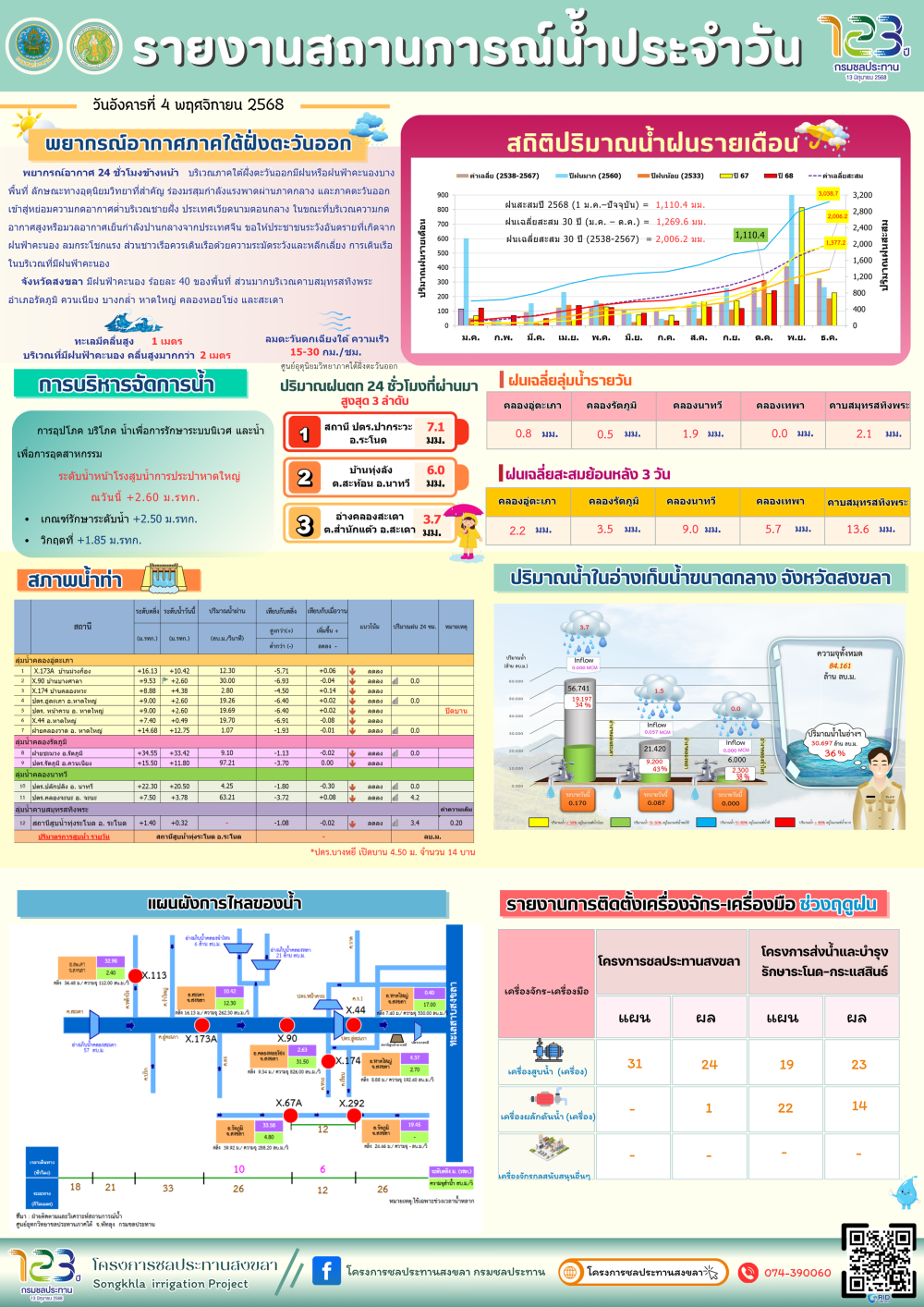 รายงานสถานการณ์น้ำ โครงการชลประทานสงขลา ประจำวันที่ 4 พฤศจิกายน 2568ที่มา : โครงการชลประทานสงขลา สำนักงานชลประทาน ที่ 16