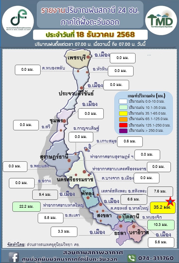 รายงานปริมาณฝนอำเภอ 24 ชม. จังหวัดสงขลา วันที่ 18 ธันวาคม 2568ปริมาณฝนตั้งแต่เวลา 07.00 น.เมื่อวานนี้ ถึง 07.00 น. วันนี้ที่มา : ศูนย์อุตุนิยมวิทยาภาคใต้ฝั่งตะวันออก