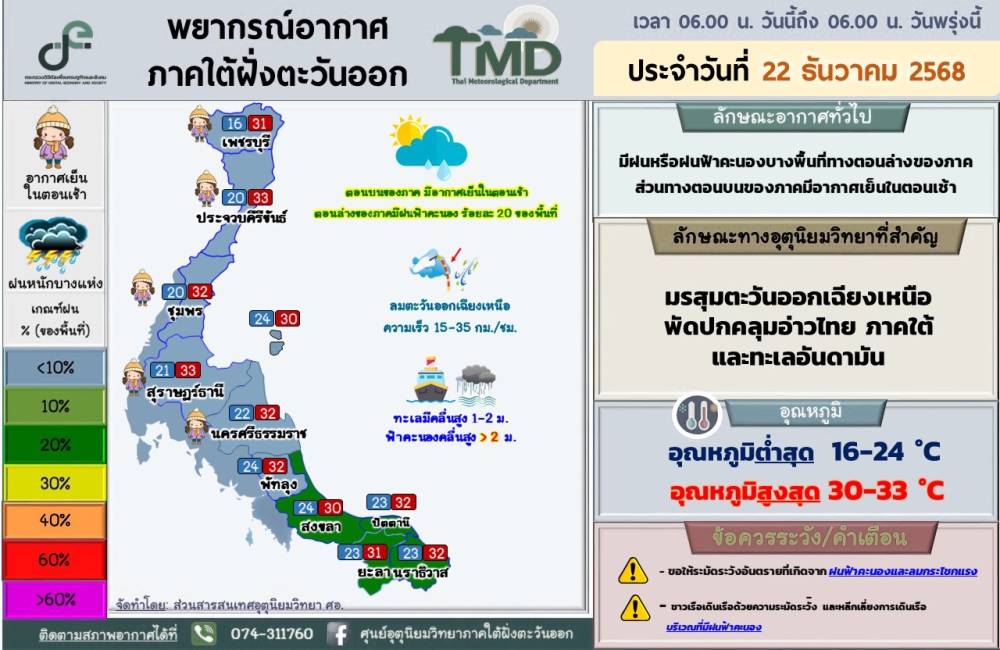 พยากรณ์อากาศภาคใต้ฝั่งตะวันออก ประจำวันที่ 22 ธันวาคม 2568เวลา 06.00 น. วันนี้ถึง 06.00 น. วันพรุ่งนี้ที่มา : ศูนย์อุตุนิยมวิทยาภาคใต้ฝั่งตะวันออก