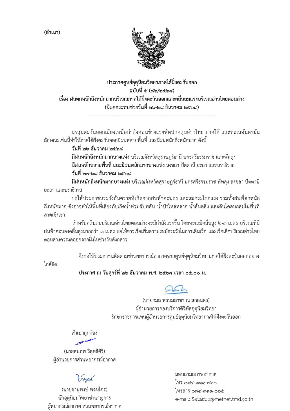 ประกาศศูนย์อุตุนิยมวิทยาภาคใต้ฝั่งตะวันออก ฉบับที่ 5 (86/2568) เรื่อง ฝนตกหนักถึงหนักมากบริเวณภาคใต้ฝั่งตะวันออกและคลื่นลมแรงบริเวณอ่าวไทยตอนล่าง (มีผลกระทบช่วงวันที่ 26-28 ธันวาคม 2568)