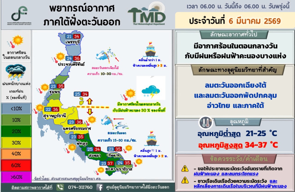 พยากรณ์อากาศภาคใต้ฝั่งตะวันออก ประจำวันที่ 6 มีนาคม 2569เวลา 06.00 น. วันนี้ถึง 06.00 น. วันพรุ่งนี้ที่มา : ศูนย์อุตุนิยมวิทยาภาคใต้ฝั่งตะวันออก