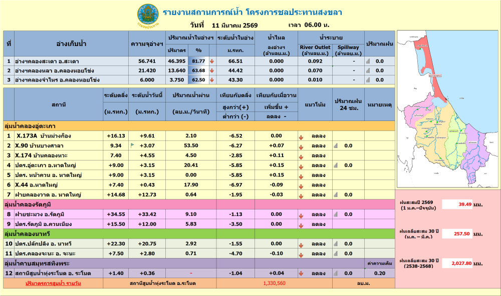 รายงานสถานการณ์น้ำ ประจำวันที่ 11 มีนาคม 2569ที่มา : โครงการชลประทานสงขลา สำนักงานชลประทาน ที่ 16ที่มา : ศูนย์อุตุนิยมวิทยาภาคใต้ฝั่งตะวันออกจัดทำโดยกลุ่มสารสนเทศการเกษตร