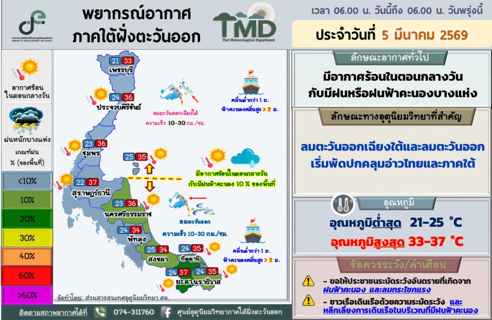 พยากรณ์อากาศภาคใต้ฝั่งตะวันออก ประจำวันที่ 5 มีนาคม 2569เวลา 06.00 น. วันนี้ถึง 06.00 น. วันพรุ่งนี้ที่มา : ศูนย์อุตุนิยมวิทยาภาคใต้ฝั่งตะวันออก