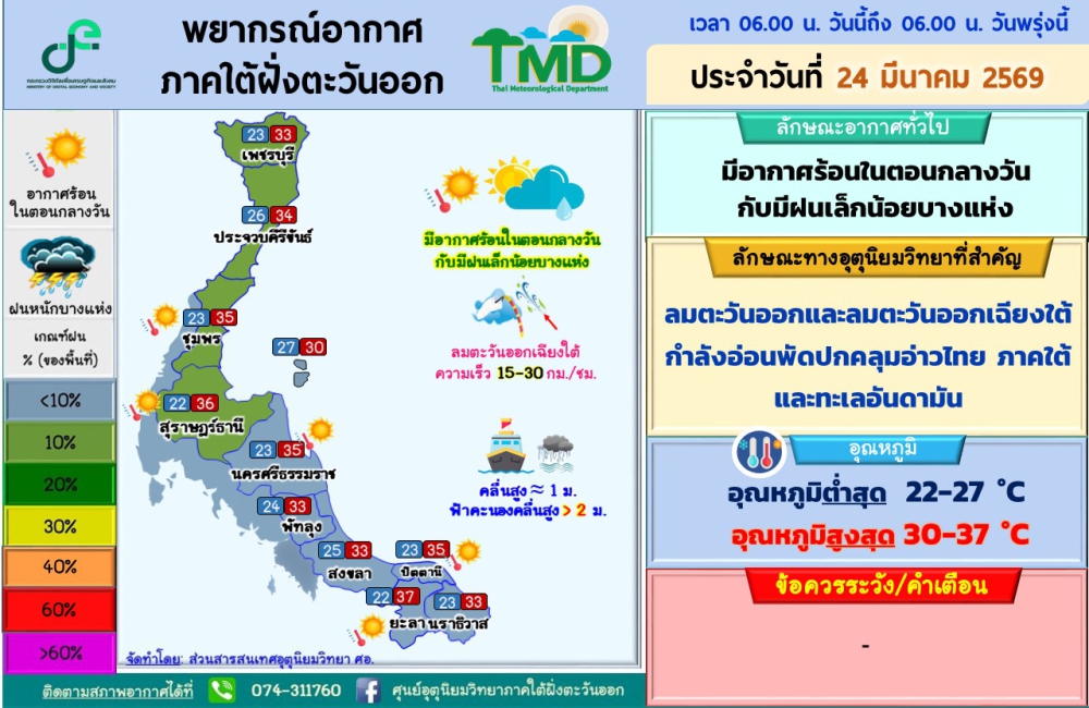 พยากรณ์อากาศภาคใต้ฝั่งตะวันออก ประจำวันที่ 24 มีนาคม 2569เวลา 06.00 น. วันนี้ถึง 06.00 น. วันพรุ่งนี้ที่มา : ศูนย์อุตุนิยมวิทยาภาคใต้ฝั่งตะวันออก