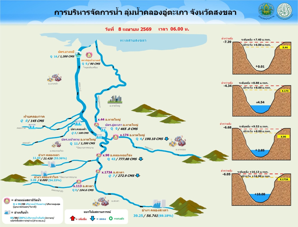รายงานสถานการณ์น้ำ โครงการชลประทานสงขลา ประจำวันที่ 8 เมษายน 2569ที่มา : โครงการชลประทานสงขลา สำนักงานชลประทาน ที่ 16