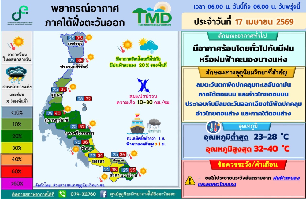 พยากรณ์อากาศภาคใต้ฝั่งตะวันออก ประจำวันที่ 17 เมษายน 2569เวลา 06.00 น. วันนี้ถึง 06.00 น. วันพรุ่งนี้ที่มา : ศูนย์อุตุนิยมวิทยาภาคใต้ฝั่งตะวันออก