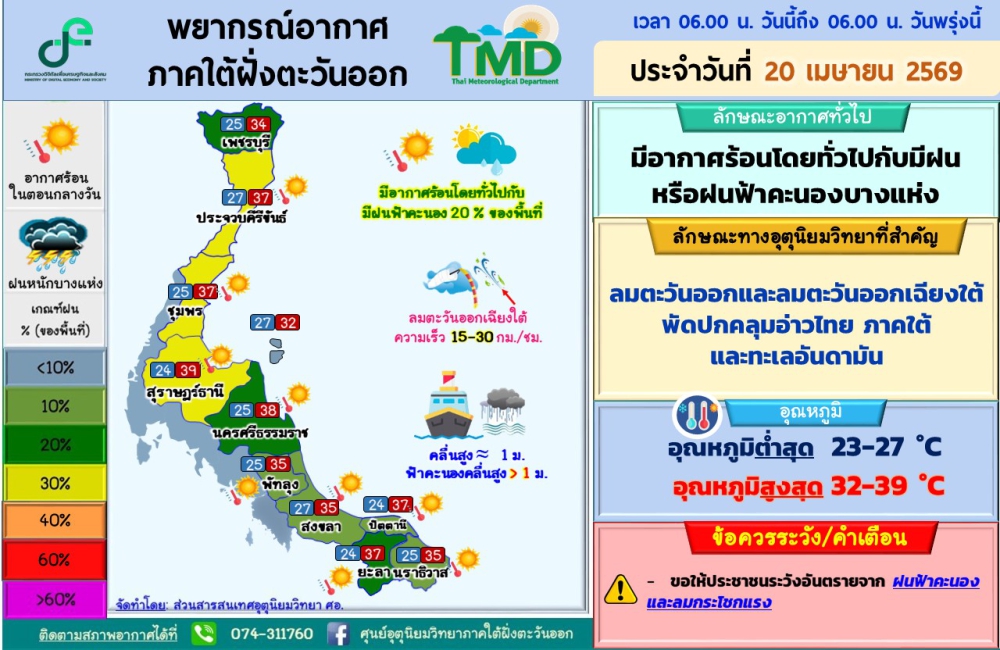 พยากรณ์อากาศภาคใต้ฝั่งตะวันออก ประจำวันที่ 20 เมษายน 2569เวลา 06.00 น. วันนี้ถึง 06.00 น. วันพรุ่งนี้ที่มา : ศูนย์อุตุนิยมวิทยาภาคใต้ฝั่งตะวันออก