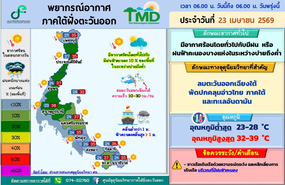 พยากรณ์อากาศภาคใต้ฝั่งตะวันออก ประจำวันที่ 23 เมษายน 2569เวลา 06.00 น. วันนี้ถึง 06.00 น. วันพรุ่งนี้ที่มา : ศูนย์อุตุนิยมวิทยาภาคใต้ฝั่งตะวันออก