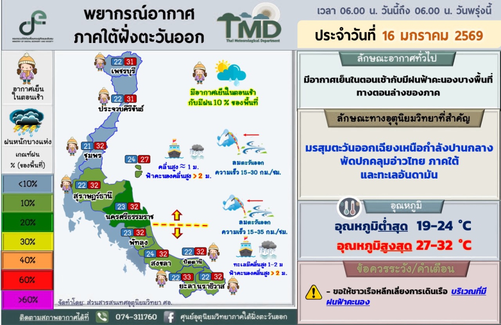 พยากรณ์อากาศภาคใต้ฝั่งตะวันออก ประจำวันที่ 16 มกราคม 2569เวลา 06.00 น. วันนี้ถึง 06.00 น. วันพรุ่งนี้ที่มา : ศูนย์อุตุนิยมวิทยาภาคใต้ฝั่งตะวันออก