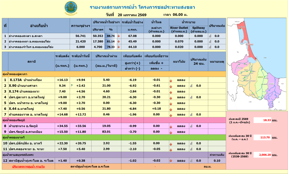 รายงานสถานการณ์น้ำ ประจำวันที่ 20 มกราคม 2569ที่มา : โครงการชลประทานสงขลา สำนักงานชลประทาน ที่ 16ที่มา : ศูนย์อุตุนิยมวิทยาภาคใต้ฝั่งตะวันออกจัดทำโดยกลุ่มสารสนเทศการเกษตร