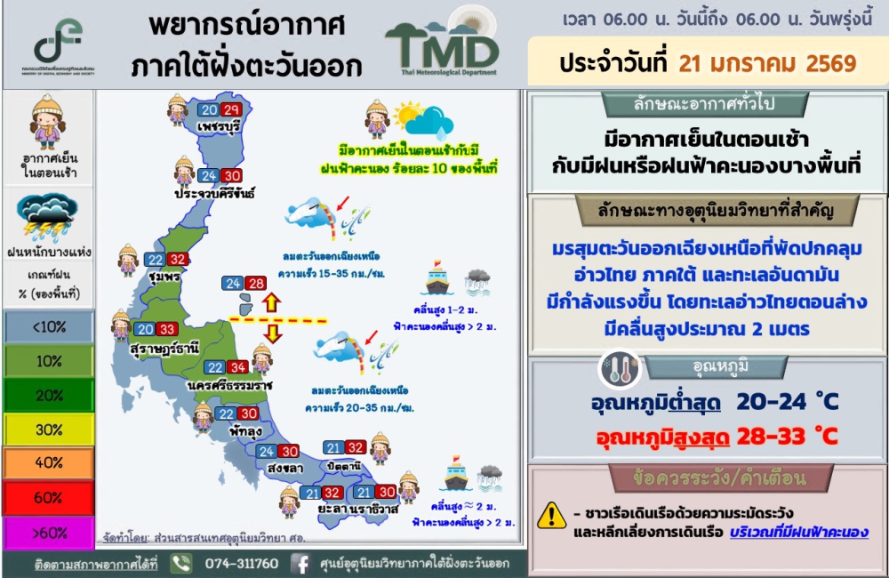 พยากรณ์อากาศภาคใต้ฝั่งตะวันออก ประจำวันที่ 21 มกราคม 2569เวลา 06.00 น. วันนี้ถึง 06.00 น. วันพรุ่งนี้ที่มา : ศูนย์อุตุนิยมวิทยาภาคใต้ฝั่งตะวันออก