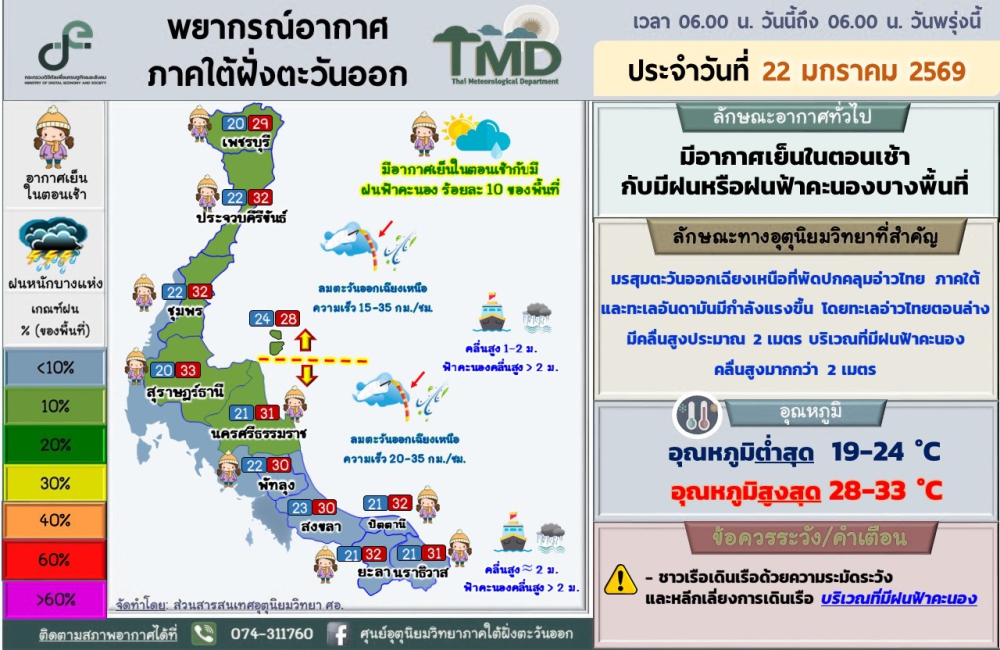 พยากรณ์อากาศภาคใต้ฝั่งตะวันออก ประจำวันที่ 22 มกราคม 2569เวลา 06.00 น. วันนี้ถึง 06.00 น. วันพรุ่งนี้ที่มา : ศูนย์อุตุนิยมวิทยาภาคใต้ฝั่งตะวันออก