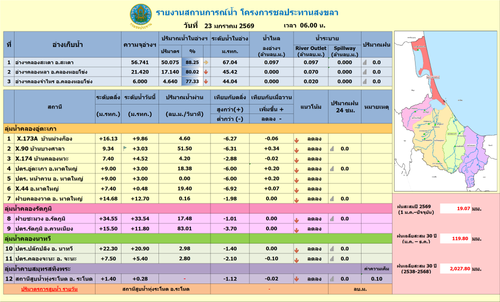 รายงานสถานการณ์น้ำ ประจำวันที่ 23 มกราคม 2569ที่มา : โครงการชลประทานสงขลา สำนักงานชลประทาน ที่ 16ที่มา : ศูนย์อุตุนิยมวิทยาภาคใต้ฝั่งตะวันออกจัดทำโดยกลุ่มสารสนเทศการเกษตร
