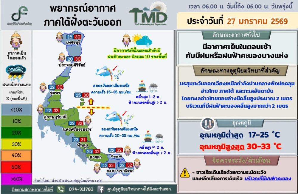 พยากรณ์อากาศภาคใต้ฝั่งตะวันออก ประจำวันที่ 27 มกราคม 2569เวลา 06.00 น. วันนี้ถึง 06.00 น. วันพรุ่งนี้ที่มา : ศูนย์อุตุนิยมวิทยาภาคใต้ฝั่งตะวันออก