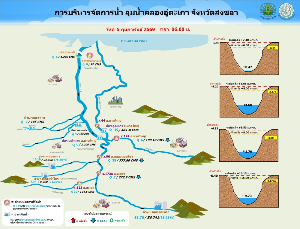 รายงานสถานการณ์น้ำ โครงการชลประทานสงขลา ประจำวันที่ 5 กุมภาพันธ์ 2569ที่มา : โครงการชลประทานสงขลา สำนักงานชลประทาน ที่ 16