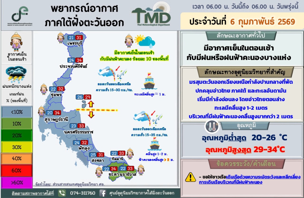 พยากรณ์อากาศภาคใต้ฝั่งตะวันออก ประจำวันที่ 6 กุมภาพันธ์ 2569เวลา 06.00 น. วันนี้ถึง 06.00 น. วันพรุ่งนี้ที่มา : ศูนย์อุตุนิยมวิทยาภาคใต้ฝั่งตะวันออก
