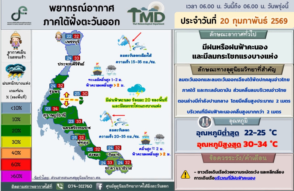 พยากรณ์อากาศภาคใต้ฝั่งตะวันออก ประจำวันที่ 20 กุมภาพันธ์ 2569เวลา 06.00 น. วันนี้ถึง 06.00 น. วันพรุ่งนี้ที่มา : ศูนย์อุตุนิยมวิทยาภาคใต้ฝั่งตะวันออก