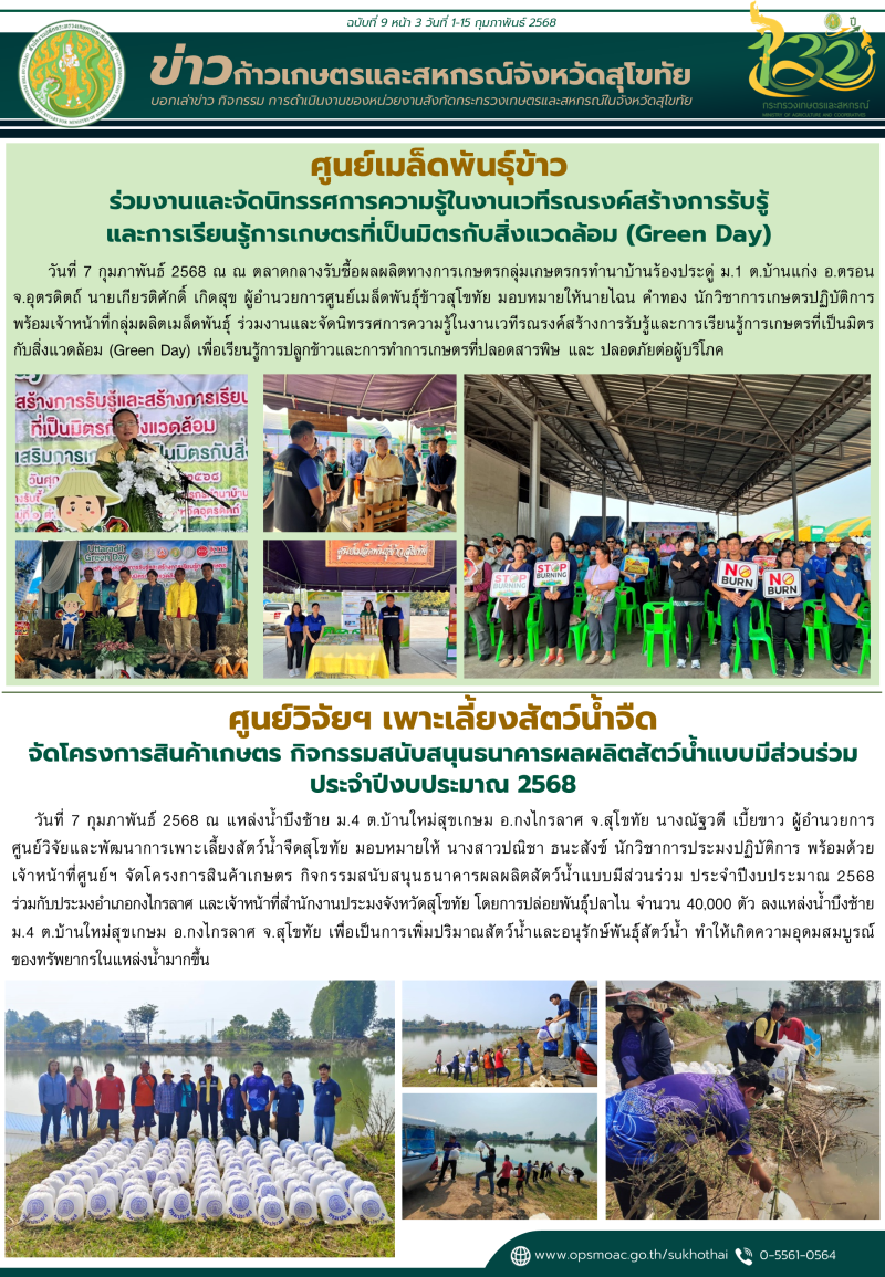 "ข่าวก้าวเกษตร" กิจกรรมของหน่วยงานในสังกัดกระทรวงเกษตรและสหกรณ์ จังหวัดสุโขทัย ช่วงระหว่างวันที่ 1-15 กุมภาพันธ์ 2568