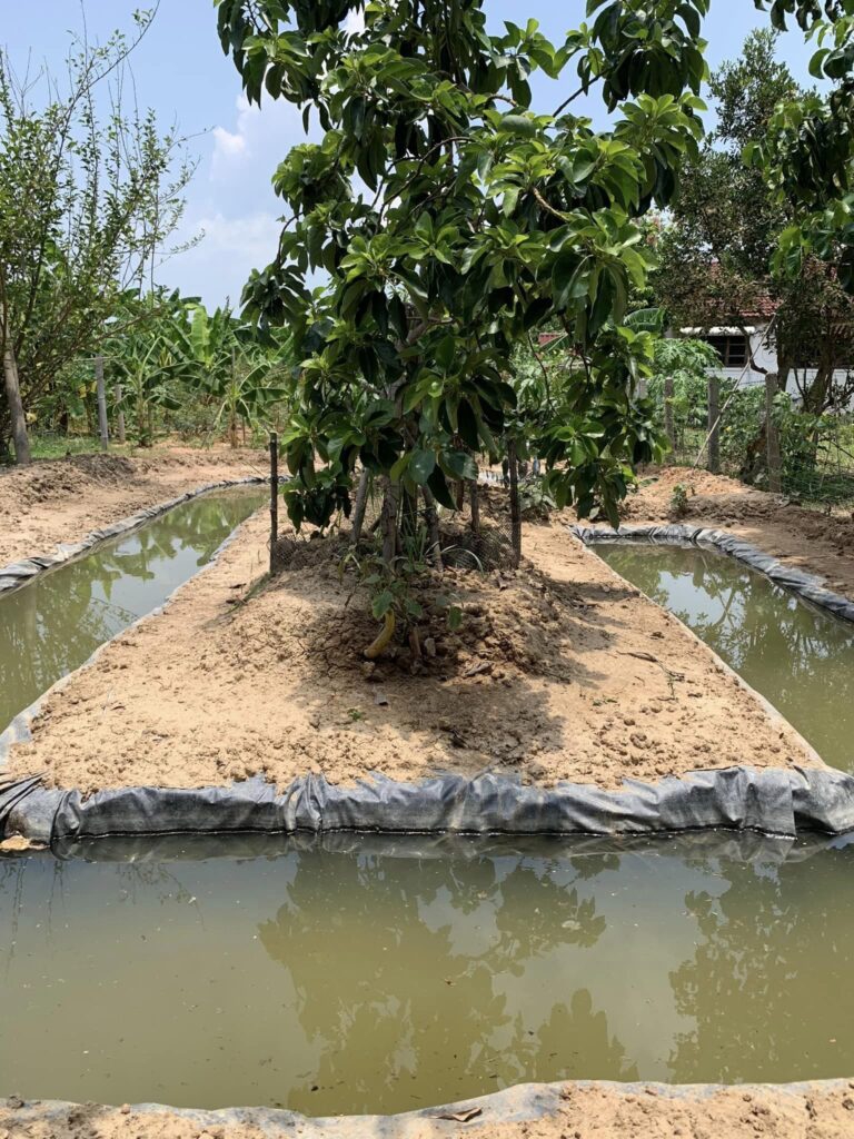 ให้ขุดเป็นร่องโดยมีความกว้างและความลึก 50 เซนติเมตร โดยนำดินที่ได้จากการขุดขึ้นมาถมในฝั่งตรงข้ามของแหล่งน้ำที่ไหลมา ทำคันดินให้กว้าง 1 เมตร แล้วปลูกแฝกเพื่อลดการพังทลายของคันดิน ปลูกไม้ผล และผักสวนครัวไว้เป็นแหล่งอาหาร