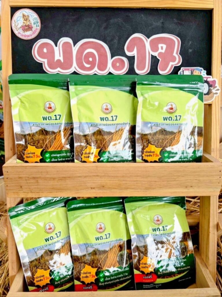 ดร.ทวีศักดิ์ ธนเดโชพล อธิบดีกรมพัฒนาที่ดิน กล่าวว่า “ผลิตภัณฑ์ พด.17 ถือเป็นนวัตกรรมชีวภาพชนิดใหม่ที่กรมพัฒนาที่ดินใช้เวลาวิจัยและพัฒนานานกว่า 4 ปี จนได้สารชีวภาพที่มีประสิทธิภาพสูง ประกอบด้วย จุลินทรีย์และเอนไซม์ที่ช่วยเร่งการ ย่อยสลายตอซังข้าวและข้าวโพดได้รวดเร็วภายใน 7 วัน เป็นผลิตภัณฑ์พร้อมใช้ 1 ซอง ละลายน้ำ 50-100 ลิตร ปล่อยไปตามน้ำเข้านา หรือฉีดพ่นลงบนตอซังให้ทั่วพื้นที่ 1ไร่ โดยประโยชน์ของการไถกลบตอซังช่วยเพิ่มอินทรียวัตถุ และธาตุอาหารพืชในดิน ซึ่งการไถกลบตอซังข้าวในพื้นที่ 1 ไร่ ให้ไนโตรเจน 3.32 กิโลกรัม ฟอสฟอรัส 0.91 กิโลกรัม และโพแทสเซียม 10.08 กิโลกรัม นอกจากนี้ยังช่วยเพิ่มปริมาณจุลินทรีย์และสิ่งมีชีวิตที่เป็นประโยชน์ในดิน ลดการเผาตอซังซึ่งเป็นปัญหาสำคัญที่ส่งผลกระทบต่อคุณภาพดิน การสูญเสียอินทรียวัตถุ รวมถึงทำลายระบบนิเวศในดิน อีกทั้งยังทำให้เกิดฝุ่นควันและมลพิษในอากาศ ก่อให้เกิดภาวะโลกร้อนและปัญหาสุขภาพในวงกว้าง กรมพัฒนาที่ดินจึงผลักดันการใช้ผลิตภัณฑ์ชีวภาพอย่างต่อเนื่องเพื่อแก้ไขปัญหาดังกล่าว โดยก่อนหน้านี้ได้ส่งเสริมให้เกษตรกรใช้น้ำหมักชีวภาพจากสารเร่งซุปเปอร์ พด.2 ซึ่งใช้เวลาย่อยสลายประมาณ 15วัน แต่ปัจจุบันด้วย พด.17 ทำให้สามารถลดเวลาเหลือเพียงครึ่งหนึ่ง ตอบโจทย์เกษตรกรที่ต้องการเตรียมดินเพาะปลูกอย่างรวดเร็ว”
