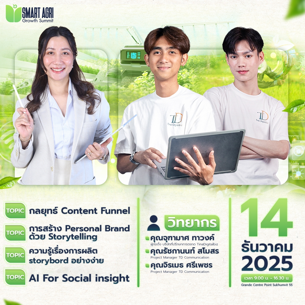 งานสัมมนาครั้งประวัติศาสตร์รวมผู้เชี่ยวชาญ Young Smart Farmer ภาครัฐ–เอกชน และผู้ประกอบการรุ่นใหม่ ร่วมวางรากฐานมาตรฐานสินค้าเกษตร ยกระดับเทคโนโลยี IoT ผสาน AI–Data–Storytelling เพื่อผลักดันเกษตรกรไทยให้ “ขายได้จริง” พร้อมกิจกรรมสร้างเครือข่ายธุรกิจใน Sitdown Dinner สุดพิเศษ จัดวันที่ 13–14 ธันวาคม 2568 ณ โรงแรมแกรนด์ เซนเตอร์ พอยต์ สุขุมวิท 55