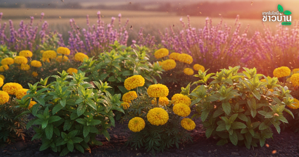 ดาวเรืองมีดอกสีส้ม–เหลืองสวยสด มีกลิ่นที่แมลงวันและยุงไม่ชอบ เหมาะสำหรับวางใกล้ประตูหรือหน้าต่าง ปลูกง่าย ทนแดด และยังช่วยปกป้องพืชอื่นในสวนจากศัตรูพืชได้ด้วย