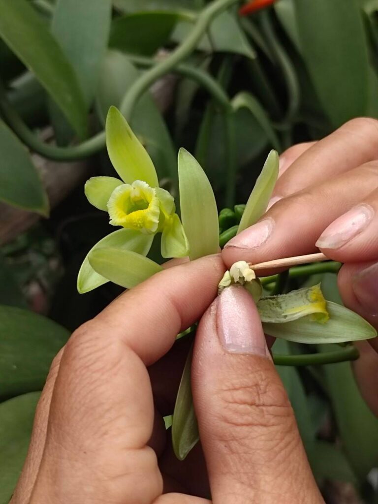 เทคนิคการผสมเกสร ดอกของวานิลลาจะเริ่มออกตั้งแต่เดือนธันวาคมไปจนถึงเดือนเมษายน เทคนิคการผสมเกสร วานิลลา 1 ดอก มีทั้งเกสรตัวผู้และตัวเมียในตัว จึงสามารถผสมในดอกเดียวกันได้เลย ใช้ไม้จิ้มฟันเขี่ยให้เกสรตัวผู้ตกลงไปยังเกสรตัวเมียอย่างเบามือ จากนั้นใช้มือช่วยจัดให้เกสรผสมกัน หลังจากนั้นนับไปอีกประมาณ 7-8 เดือน จึงจะเริ่มเก็บผลผลิตได้
