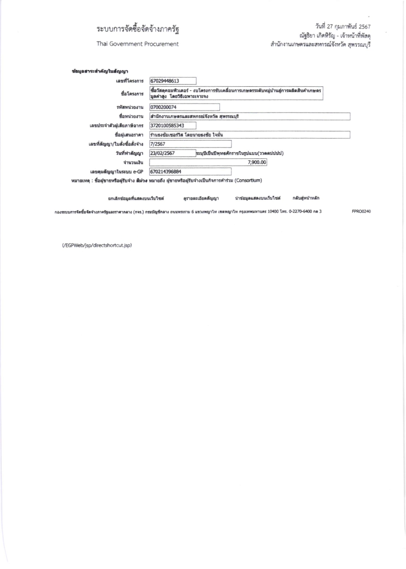 ประกาศผู้ชนะการเสนอราคา ซื้อวัสดุคอมพิวเตอร์ (งบโครงการขับเคลื่อนการเกษตรระดับหมู่บ้านสู่การผลิตสินค้าเกษตรมูลค่าสูง)