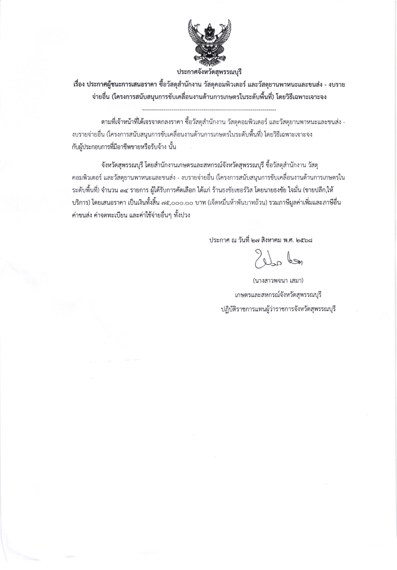 ประกาศผู้ชนะการเสนอราคา ซื้อวัสดุสำนักงาน วัสดุคอมพิวเตอร์ และวัสดุยานพาหนะและขนส่ง (งบรายจ่ายอื่น)