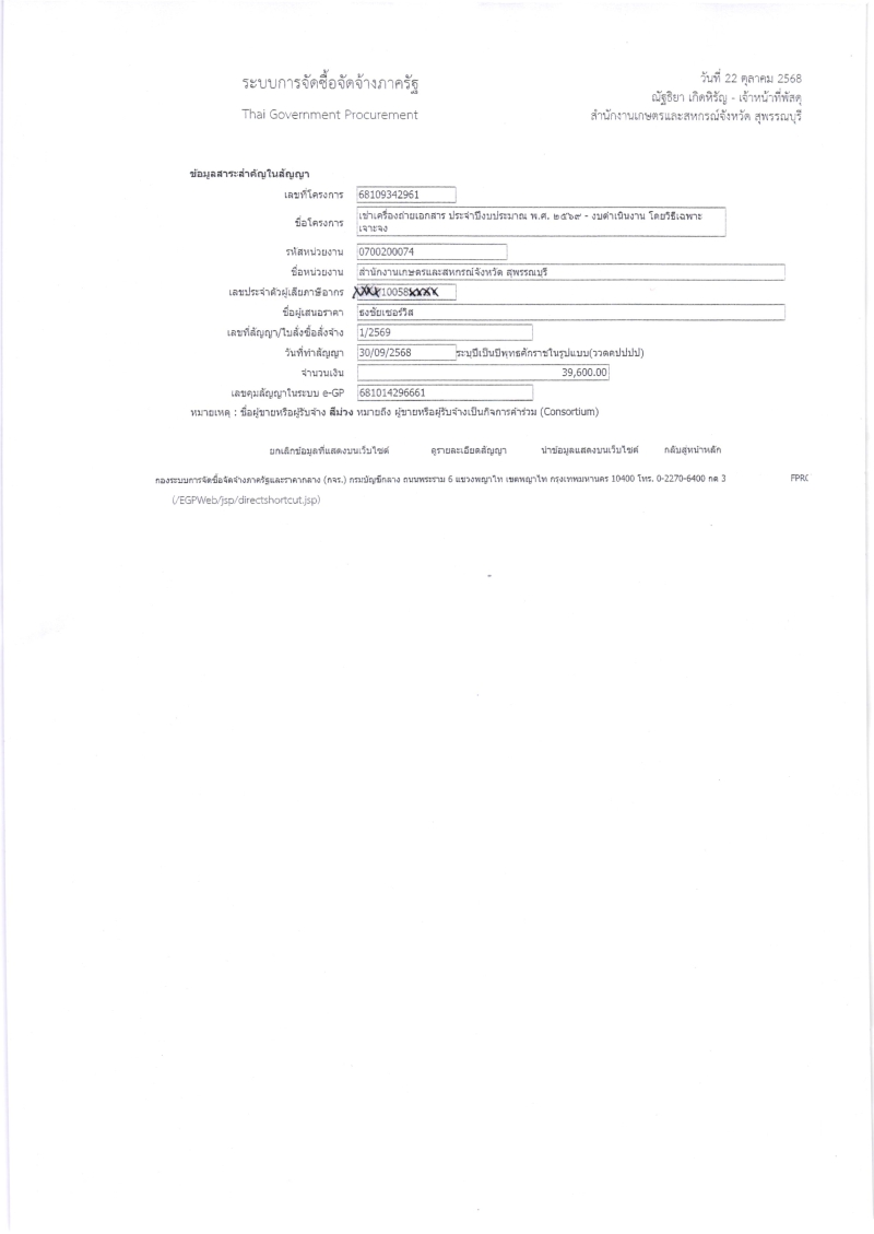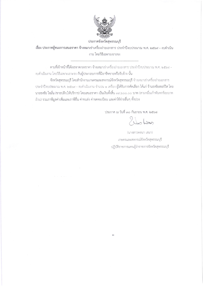 ประกาศผู้ชนะการเสนอราคา จ้างเหมาเช่าเครื่องถ่ายเอกสาร ประจำปีงบประมาณ พ.ศ. 2569