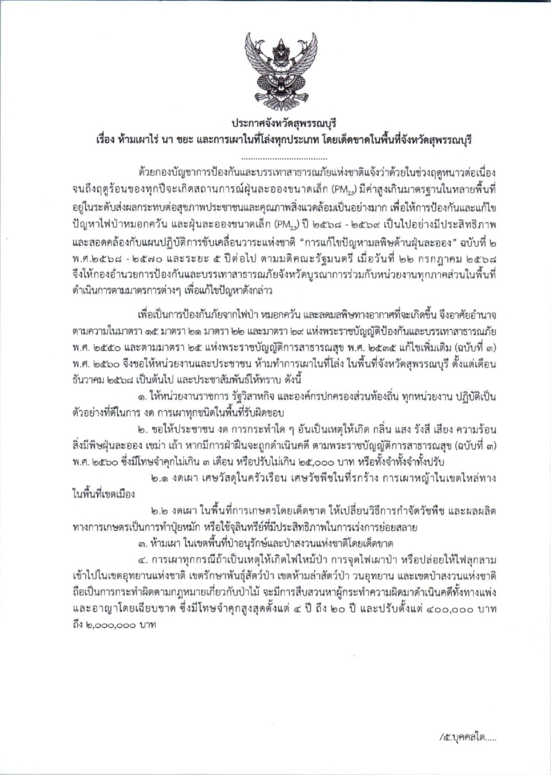 ประกาศจังหวัดสุพรรณบุรี เรื่อง ห้ามเผาไร่ นา ขยะ และการเผาในที่โล่งทุกประเภท โดยเด็ดขาดในพื้นที่จังหวัดสุพรรณบุรี