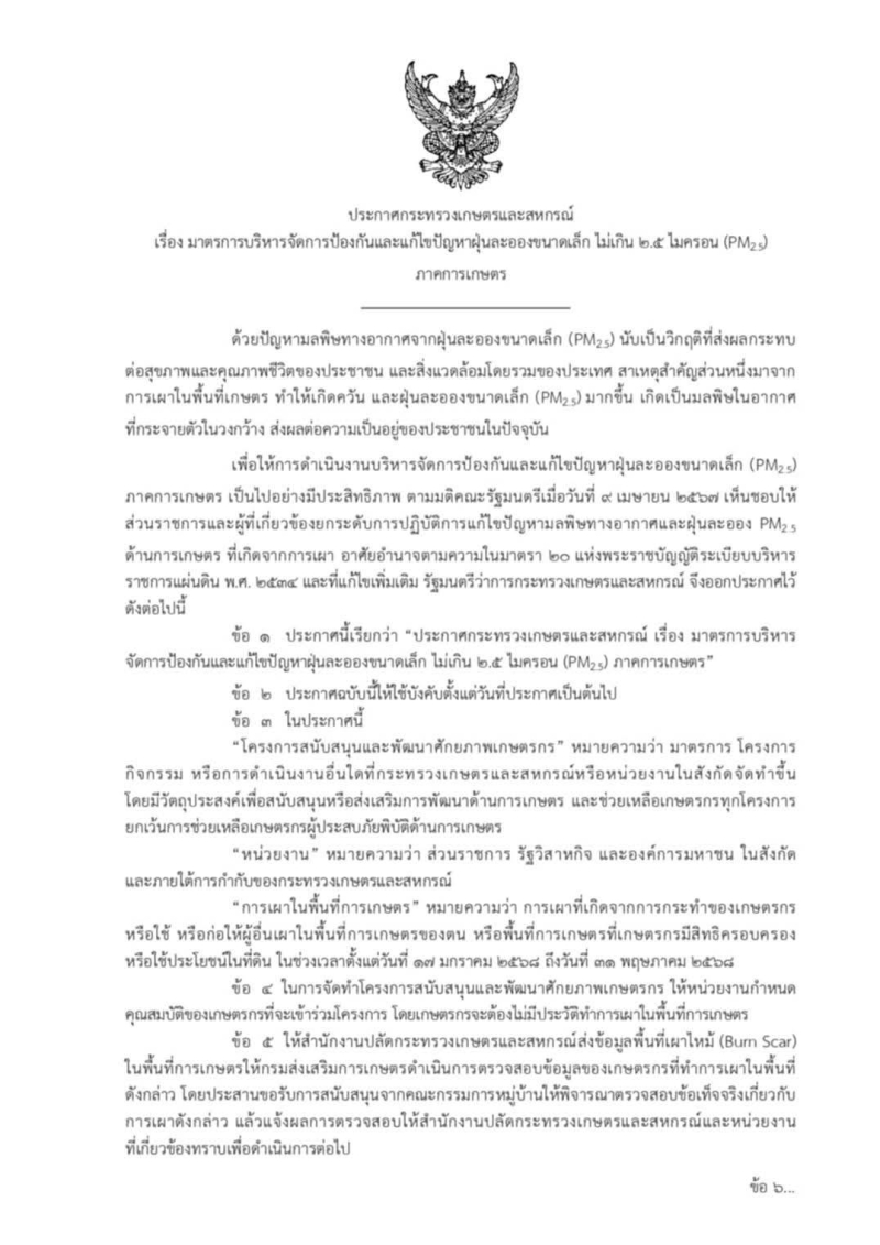 ประกาศกระทรวงเกษตรและสหกรณ์ เรื่อง มาตรการบริหารการจัดการป้องกันและแก้ไขปัญหาฝุ่นละอองขนาดเล็ก ไม่เกิน 2.5 ไมครอน (PM2.5)