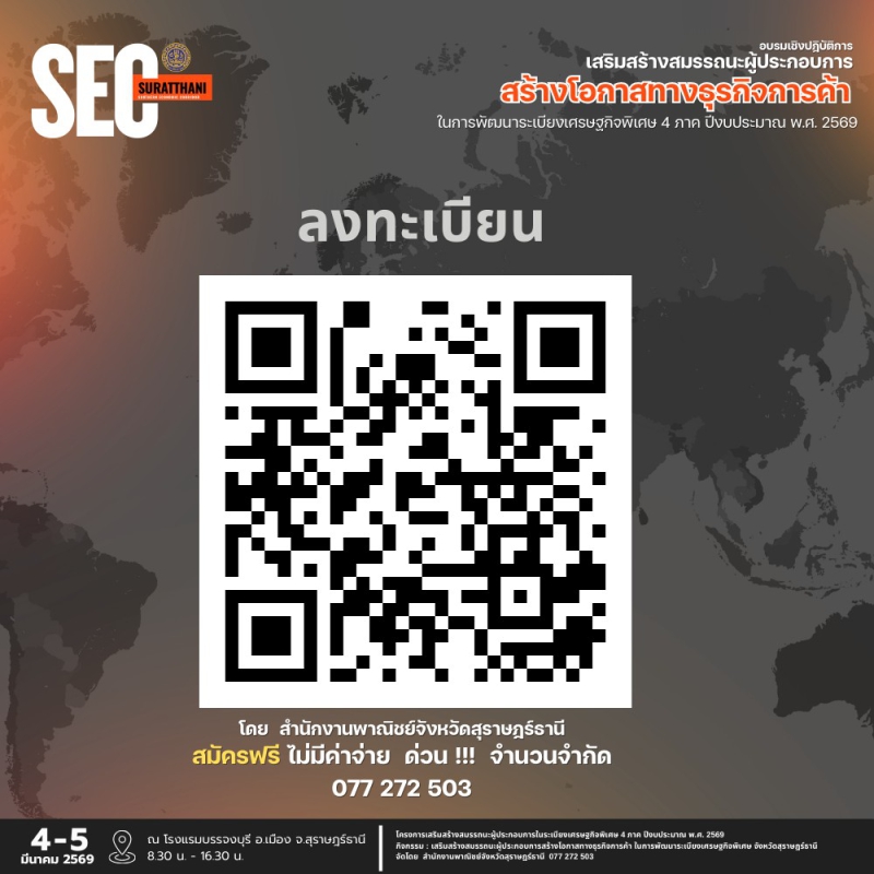 เชิญชวนอบรมเชิงปฏิบัติการเสริมสร้างสมรรถนะผู้ประกอบการ สร้างโอกาสทางธุรกิจ ระหว่างวันที่ 4-5 มีนาคม 2569 ณ โรงแรมบรรจงบุรี อำเภอเมืองฯ จังหวัดสุราษฎร์ธานี