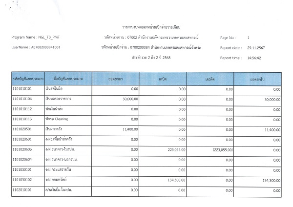 รายงานงบทดลอง สำนักงานเกษตรและสหกรณ์จังหวัดสุราษฎร์ธานี ประจำเดือนพฤศจิกายน 2567 ประจำงวด 2 ประจำปีงบประมาณ พ.ศ. 2568