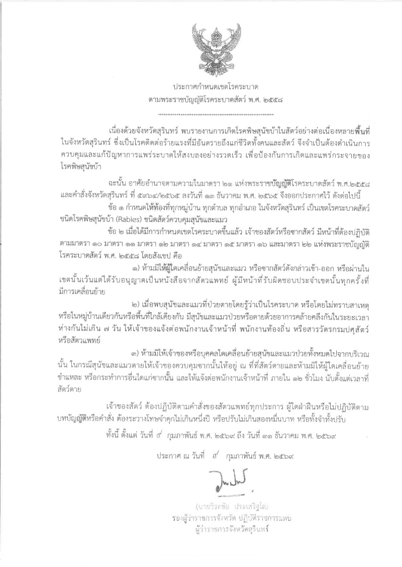 ประกาศกำหนดเขตโรคระบาด ตามพระราชบัญญัติโรคระบาดสัตว์ พ.ศ. 2558