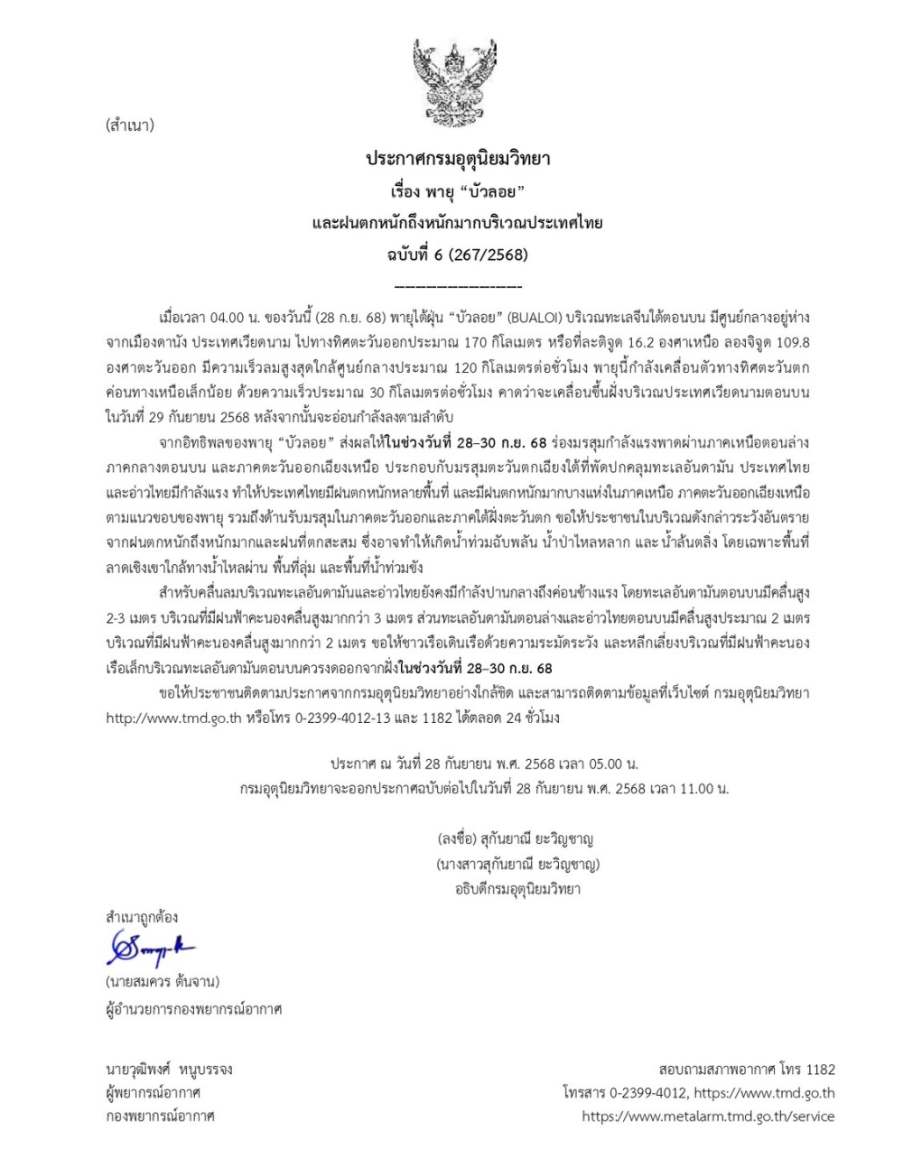 ประกาศ พายุ "บัวลอย" และฝนตกหนักถึงหนักมากบริเวณประเทศไทยตอนบน ฉบับที่ 6