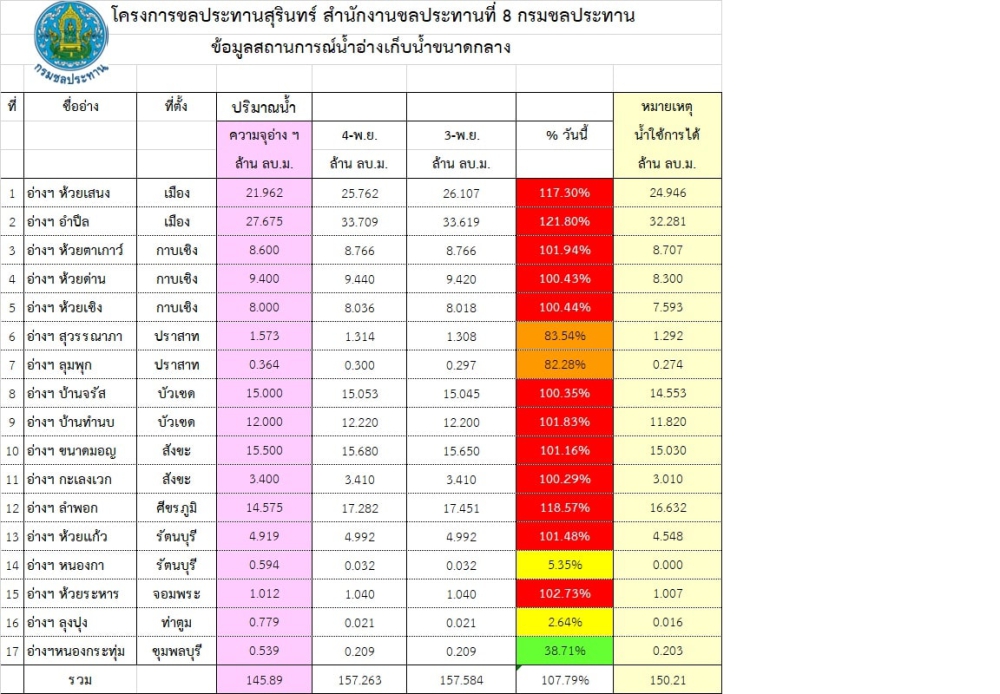 สถานการณ์น้ำจังหวัดสุรินทร์ ประจำวันที่ 4 พฤศจิกายน 2568