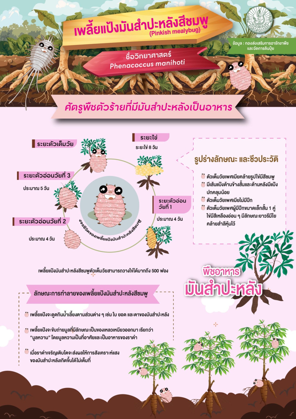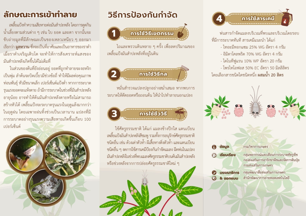 เพลี้ยแป้งทำความเสียหายต่อมันสำปะหลัง โดยการดูดกินน้ำเลี้ยงตามส่วนต่าง ๆ ของพืช จากนั้นจะขับถ่าย มูลหวาน ซึ่งเป็นที่อาศัยและเป็นอาหารของราดำ เมื่อราดำเจริญเติบโต ทำให้การสังเคราะห์แสงของมันสำปะหลังเกิดขึ้นได้ไม่เต็มที่ ต้นที่ยังอ่อนอยู่ ยอดที่ถูกทำลายจะงอหงิกเป็นพุ่ม ลำต้นจะบิดเบี้ยวมีช่วงข้อถี่ ทำให้มีผลต่อคุณภาพท่อนพันธุ์ หัวมีขนาดเล็ก เปอร์เซ็นต์แป้งต่ำ หากการระบาดรุนแรงยอดจะแห้งตาย